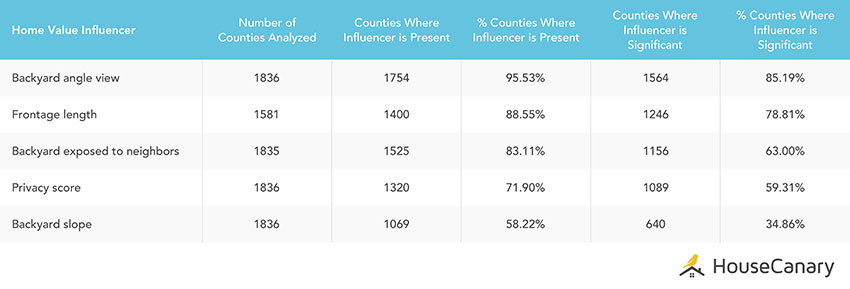 HouseCanary built regression models to predict value based on view angle, frontage length, backyard exposed angle, privacy score, and backyard slope. In these models, we also controlled for common explainers of value (location, building area, lot size, etc.). We included 1,836 counties for view angle, privacy score, and backyard slope; 1,835 counties for backyard exposed angle; and 1,581 counties for frontage length.