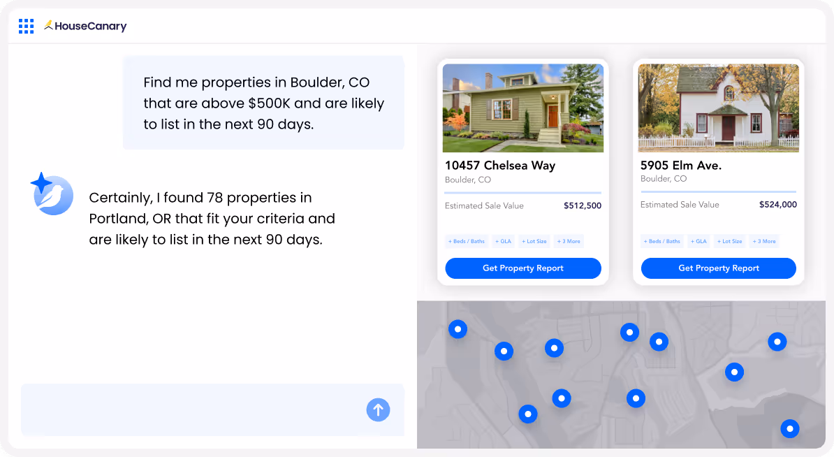 Idenitfy which homes are most likely to list in the next 90 days by using HouseCanary’s AI-powered Propensity to Sell. Find sellers before they hit the market, giving you a competitive edge in lead generation and exclusive opportunities.