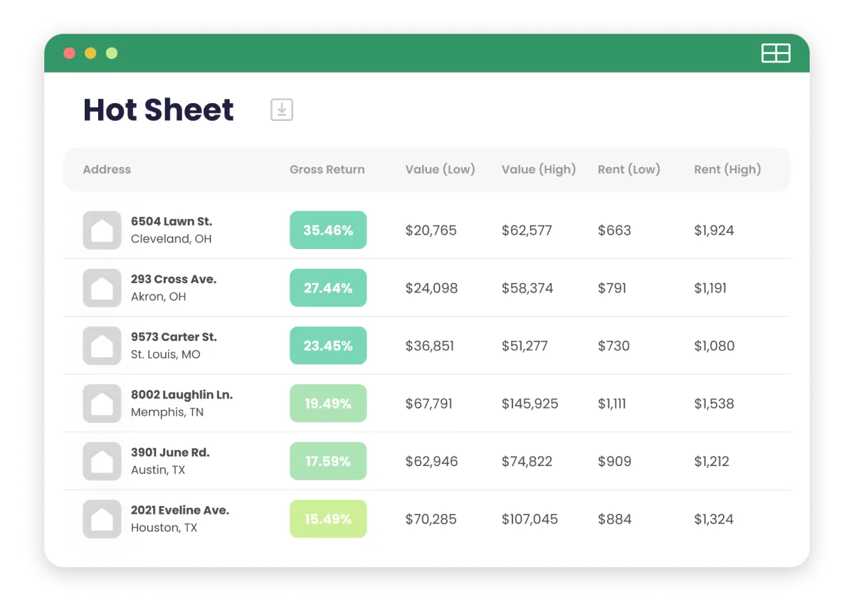 Get weekly updates on off-market SFR properties and portfolios through our exclusive investor channel, the HouseCanary Hot Sheet. Leverage our network to connect with qualified investors seeking to acquire individual assets or even your entire portfolio, streamlining the sales process. Reduce listing time and stress by finding interested buyers before your properties even hit the market.