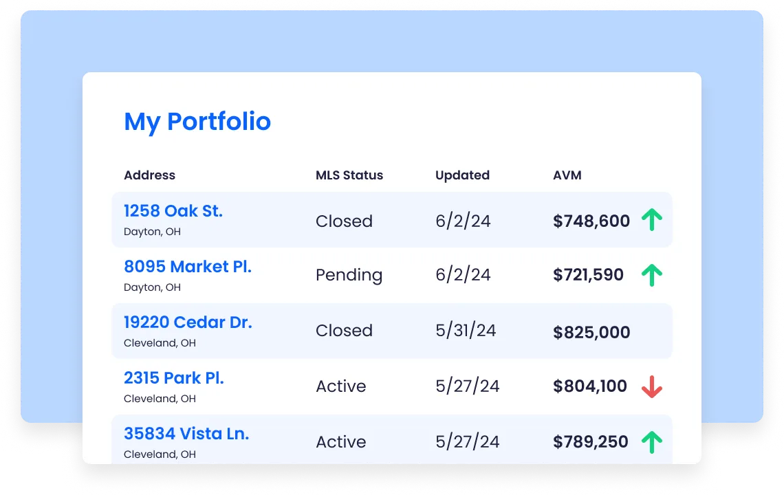 HouseCanary's Portfolio Monitoring automates portfolio reporting and property performance tracking. Gain valuable insights to support informed decision-making around asset management and dispositions. Our platform helps you streamline the process and maximize the value of your portfolio.